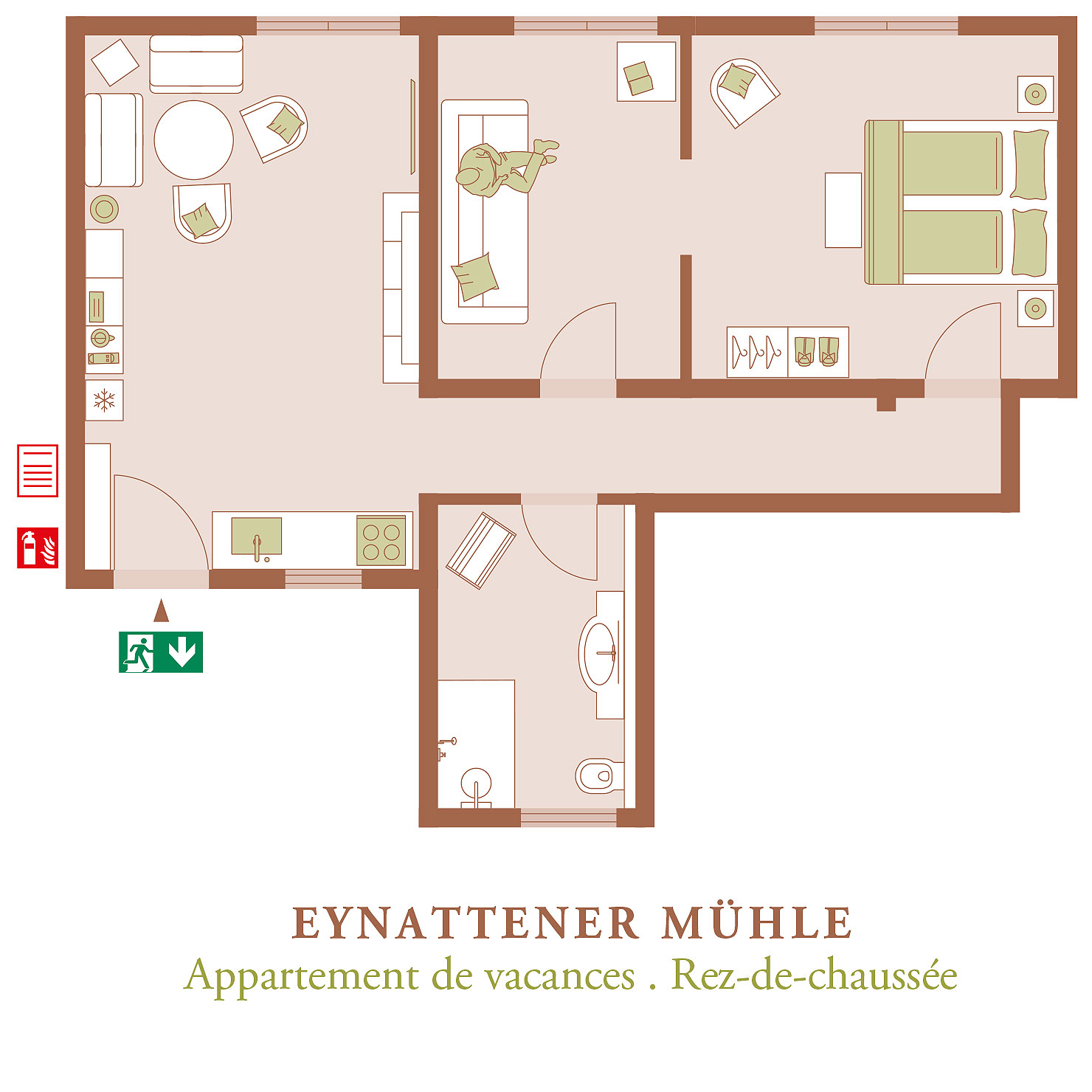 Pour rester à l’extérieur, nos hôtes utilisent une terrasse devant l’entrée – petite table avec 2 chaises – et un coin salon – table avec 4 chaises + parasol + grill – dans le pré devant la cour directement sur le ruisseau Göhl.